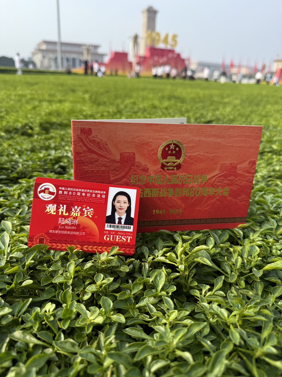 2025年9月3日,纪念中国人民抗日战争暨世界反法西斯战争胜利80周年大会在北京天安门广场隆重举行,以盛大阅兵仪式同世界人民一道纪念这个伟大的日子。全国人大代表、全国劳动模范、全国三八红旗手、博发康安控股集团董事长陆晓琳作为受邀嘉宾参加了此次阅兵活动,共同见证这一庄严时刻。