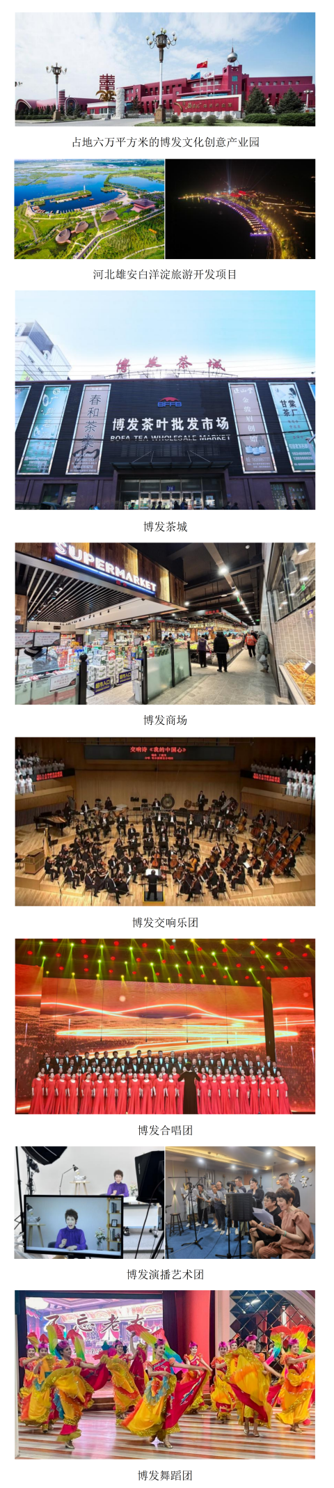 旗下博发文旅产业集团涵盖博发文化创意产业园、雄安白洋淀旅游、北京四合院文化、文旅酒店、书画院、茶城、商业服务、交响乐团、合唱团、演播艺术团和歌舞剧院等部分。其中文化创意产业园是集团投入5亿元兴建的,占地面积6万平方米,主要涵盖音乐及影视创作、文学书画艺术交流、金源文化投资开发、名家名人书画馆、婚庆文化服务等内容,是一个具有品牌竞争力和战略投资价值的园区。其中喜乐汇婚庆产业园是全国前三位,东北三省规模最大、功能最全、最具有民族特色的专业喜乐文化产业。博发书画院作为黑龙江省书法家协会副主席单位及创作基地,致力于为书法事业的发展及书法家的推广而作出贡献。商贸版块有博发茶城、博发家具百货商场、康安商贸有限公司、同江市中俄风情商业步行街、北京2家博发假日酒店、哈尔滨博发假日酒店等企业为集团创造了新的利润增长点。旅游服务作为集团新兴产业,起步快、起点高,其中之一投资10亿元打造白洋淀旅游全产业链服务成为集团一张名片。博发交响乐团成立于2021年4月,致力于弘扬和宣传主旋律,践行集团“创社会财富,还人类幸福”的企业精神,汇集了百余位优秀演奏员,多次参加哈尔滨之夏等大型文艺汇演和庆祝活动,演出经验丰富,深受省内外观众的一致好评。博发合唱团已经有20多年的历史,团队成员超过百人,演唱风格活泼欢快,是一个高水准、高素质的团队,曾参加过许多国内外大型合唱比赛和音乐会,曾获全国合唱比赛第三名、哈尔滨合唱比赛第一名等多项荣誉。博发演播艺术团由全国演播艺术家、中国金话筒人物奖获得者、播音二级教授、省演播协会会长闻佳老师带领下,致力于提升演播者的整体素质,创作高质量作品,积极传播“中国故事”,传承“尔滨声音”。博发舞蹈团依托博发舞厅作为基地,由近千名业余爱好者组成,致力于文化养老、健康养老和快乐养老,为银发经济发展推波助澜。